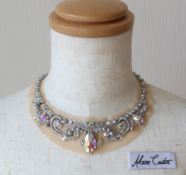 大人サイズのレースのネックレスです。 淡いシルバーの繊細なモチーフレースを使用しています。 土台部分はパワーメッシュ素材を使用しており、着け心地の良いネックレスです。 首回りなどもストーンを使用しており、舞台でキラキラと輝きます。 カラー:淡いシルバー×クリア 首回り:約40cm 中心部分幅:約5cm ベージュの細いゴム同封します。 ずれ防止に衣装の裏に縫い付けてご使用ください。 ●注意点 受注生産のため、ご注文後に制作します。 発送まで2週間ほどかかる場合がございますのでご了承ください。 ハンドメイドのため、多少の個体差が生じます。ご理解いただける方のみご購入ください。 一度に3点以上ご購入の場合は、制作にお時間がかかりますため、購入前にご連絡ください。 予備のラインストーンをご希望の場合はオプションにて選択をしてください。 各ストーン3個ずつ同封させていただきます。 ストーンのカラーチェンジは+300円にて承ります。 こちらでは購入せず、メッセージにてお問い合わせ下さい。 shopの設定上税込価格の表示となっておりますが、消費税は請求をしておりません。 税抜価格を表示しております。
