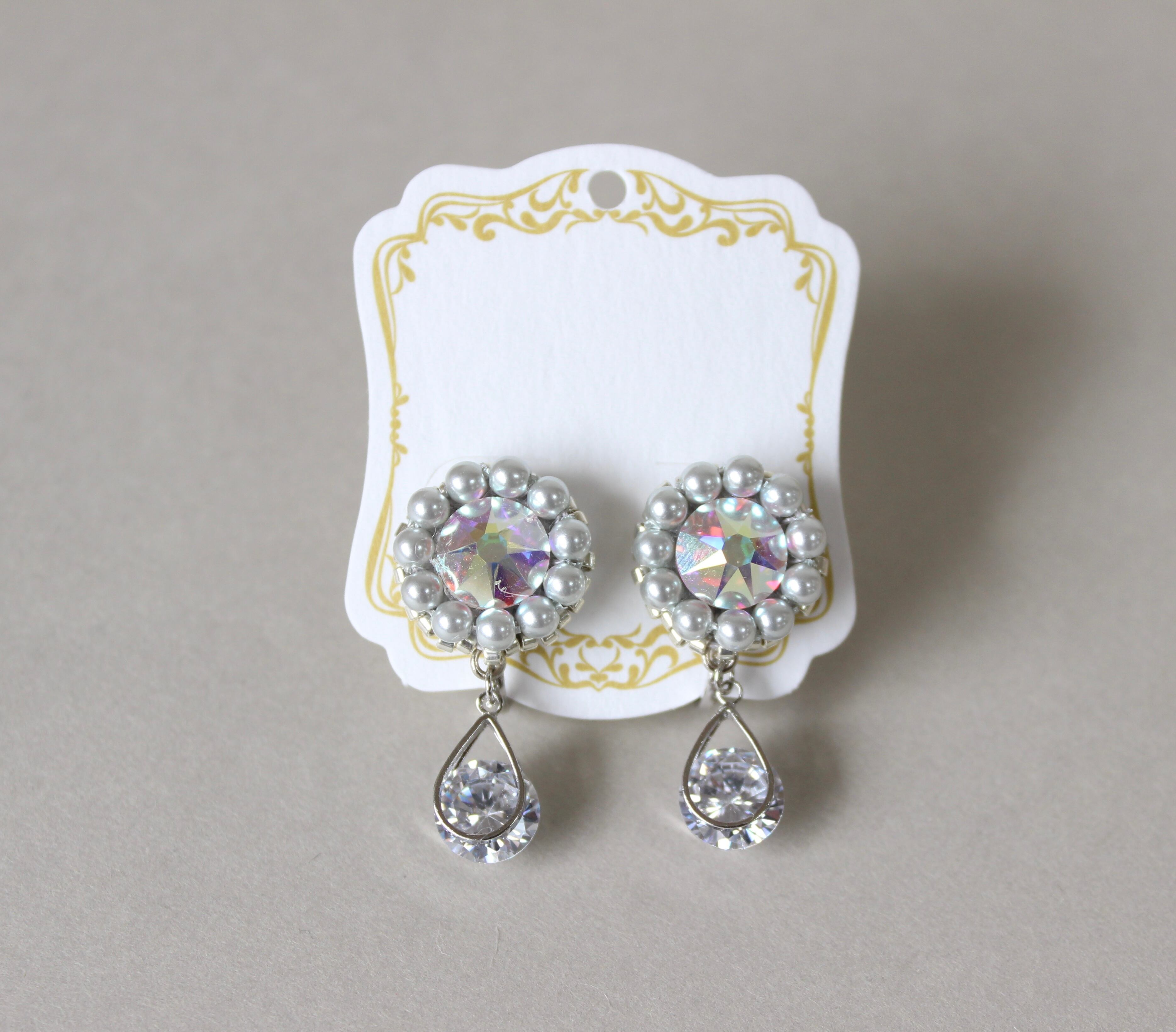 大粒のオーロラストーンのまわりにシルバーパールとビーズを縫い付けたイヤリング、ピアス。