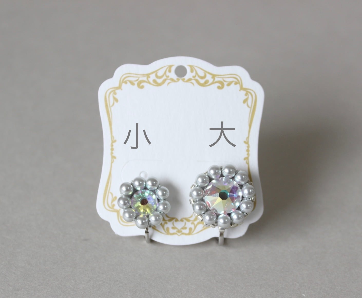 大粒のオーロラストーンのまわりにシルバーパールとビーズを縫い付けたイヤリング、ピアス。